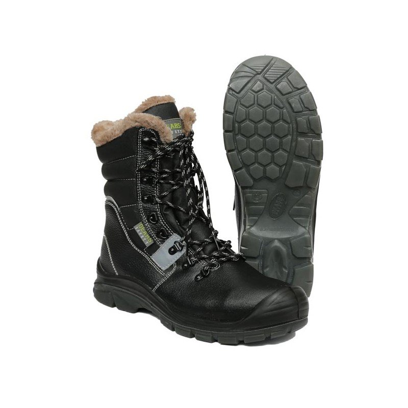 Тёплые защитные ботинки из натуральной текстурированной кожи обеспечивают надёжную защиту и комфорт при работе в различных условиях. Внутренняя отделка выполнена из искусственного меха, который полностью покрывает внутреннюю часть обуви, сохраняя тепло и создавая комфортный микроклимат. На верхней части и в области пятки расположены светоотражающие элементы, повышающие видимость в тёмное время суток. Шнуровка осуществляется с помощью 7 пар металлических кольцеобразных люверсов и 2 пар крючков, обеспечивающих плотную фиксацию стопы.