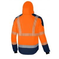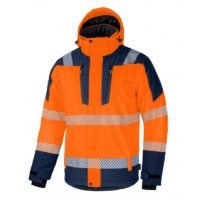 Сигнальная утеплённая куртка повышенной видимости с высоким воротником и съёмным регулируемым капюшоном. Изготовлена из дышащего и водоотталкивающего материала Softshell. Утеплитель выполнен из переработанного пластика REPREVE. Куртка оснащена качественной двусторонней молнией под клапаном на липучках и кнопках, а также дополнительной защитой подбородка. Имеет удобный воротник с мягкой подкладкой, множество карманов, включая внутренний карман «Наполеон» на молнии YKK, два нагрудных и два боковых внешних кармана на молнии с клапанами, а также два внутренних кармана на липучке. Внутренние трикотажные манжеты сохраняют тепло, низ куртки регулируется эластичным шнурком, спинка удлинена. Светоотражающие элементы 50 мм по рукавам, плечам, талии и нижней части куртки. Застёжка на спинке для удобного размещения логотипа.